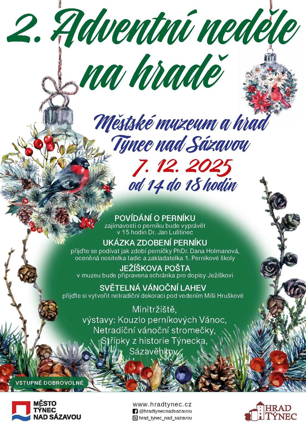 Navštivte Městské muzeum a hrad v době 2. Adventní neděle od 14 do 18 hodin. Těšit se můžete na povídání o perníku, kde se dozvíte různé zajímavosti od pana Dr. Jana Luštince. Začátek vyprávění v 15 hodin. K výstavě bude také v průběhu celého odpoledne ukázka zdobení perníků. O tu se postará oceněná nositelka tradic a zakladatelka 1. Perníkové školy PhDr. Dana Holmanová. Dále budou připraveny dílničky, schránka na Ježíškovu poštu a minitržiště. Můžete také navštívit výstavy Kouzlo perníkových Vánoc, Netradiční vánoční stromečky, Sázavěnkov a Střípky z historie Týnecka.
