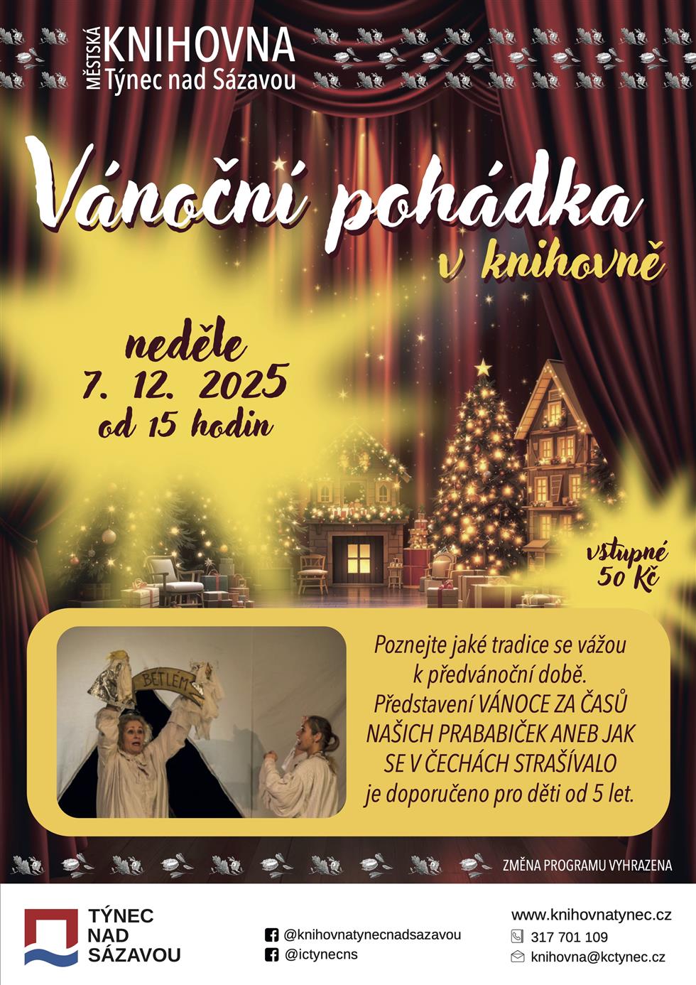 Sotva odejdou dávná strašidla, nastává v našem představení čas vánoční, kdy s dětmi postavíme Betlém z loutek, zazpíváme koledy a vzpomeneme další krásné štědrovečerní zvyky, to aby dávné časy našich prababiček znovu ožily?