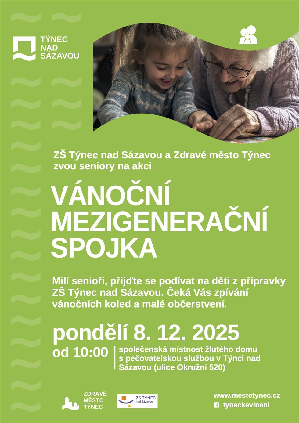 Zdravé město Týnec Vás společně se Základní školou Týnec nad Sázavou srdečně zve na Vánoční mezigenerační spojku. Milí, senioři, přijďte se podívat na děti z přípravky ZŠ Týnec nad Sázavou. Čeká Vás zpívání vánočních koled a malé občerstvení.